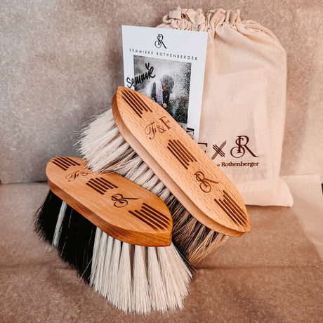 Fritz & Frodewin steht für deutsche Handwerkskunst: Bürsten aus FSC-zertifiziertes Holz und hochwertige Borsten, sorgfältig bestückt und langlebig im Einsatz – für Pferd und Hund. Unsere Bestseller kombinieren kräftige Reinigung mit edlem Glanz; besonders sanfte Modelle sind ideal für Kopf und empfindliche Partien. Auf Wunsch personalisieren wir deine Bürste per Gravur – ein Unikat mit Bedeutung.